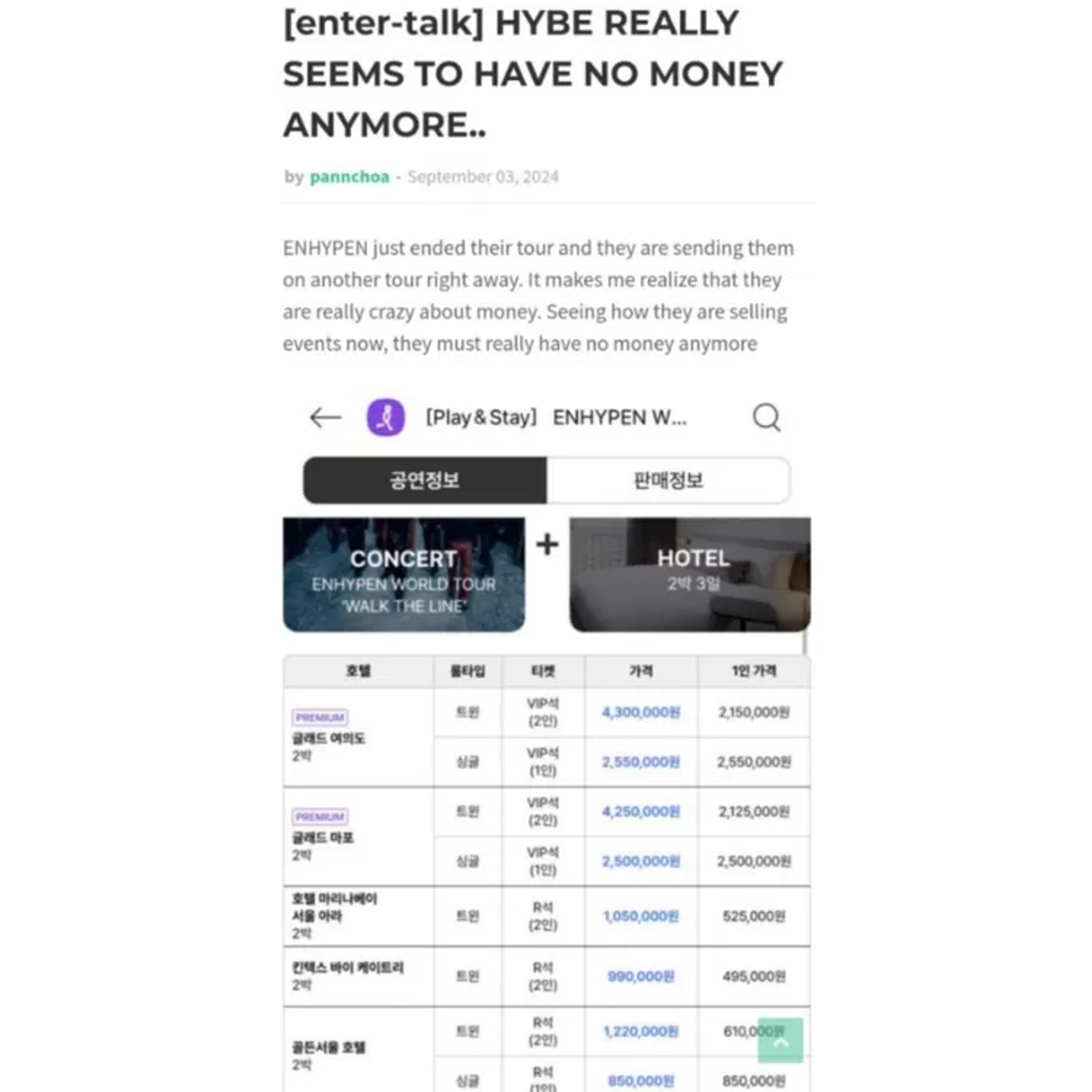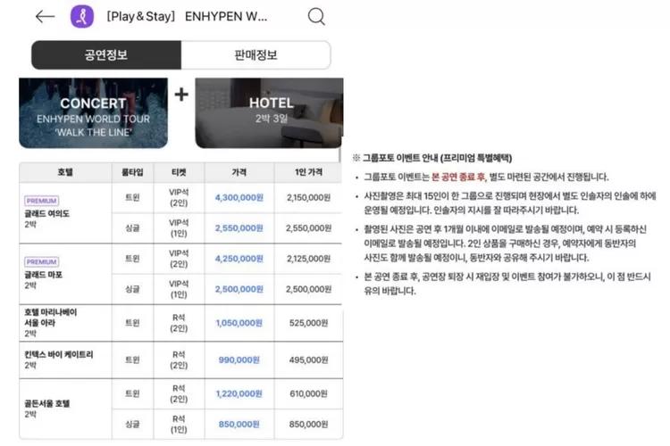 Diunggahan OP, HYBE telah membandrol harga sekitar 2,55 juta Won atau sekitar 29 juta Rupiah per orang untuk foto grup dengan ENHYPEN, tiket konser VIP, dan penginapan hotel 2 malam dengan fasilitas premium.