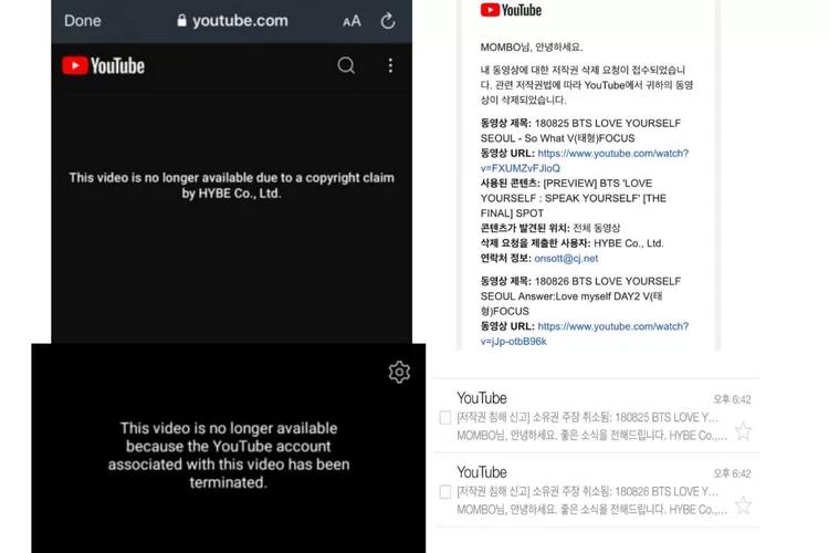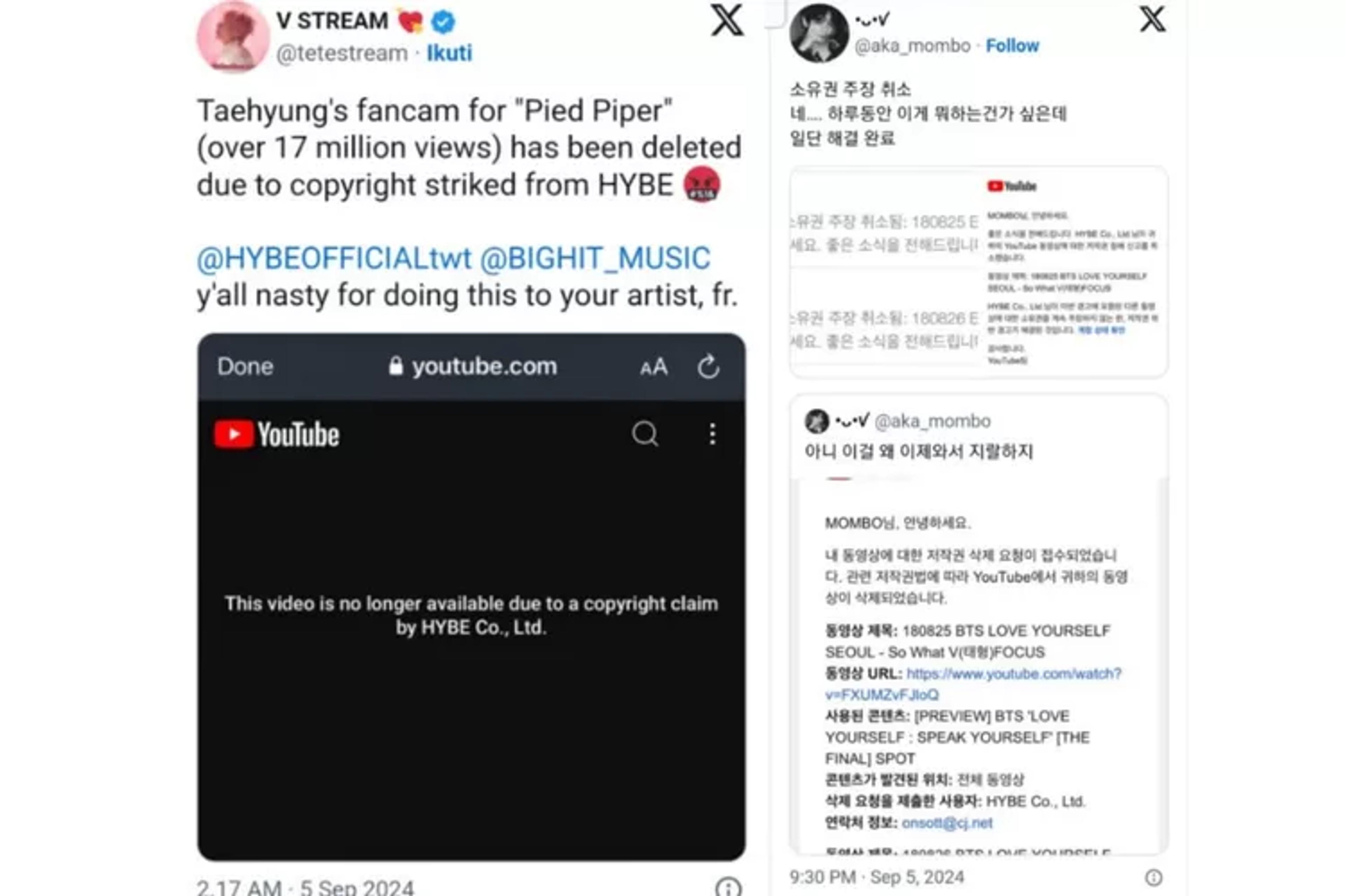 Melalui situs Pannkpop, OP mengatakan kalau HYBE membatalkan laporan pelanggaran hak cipta pada video fancam V BTS.