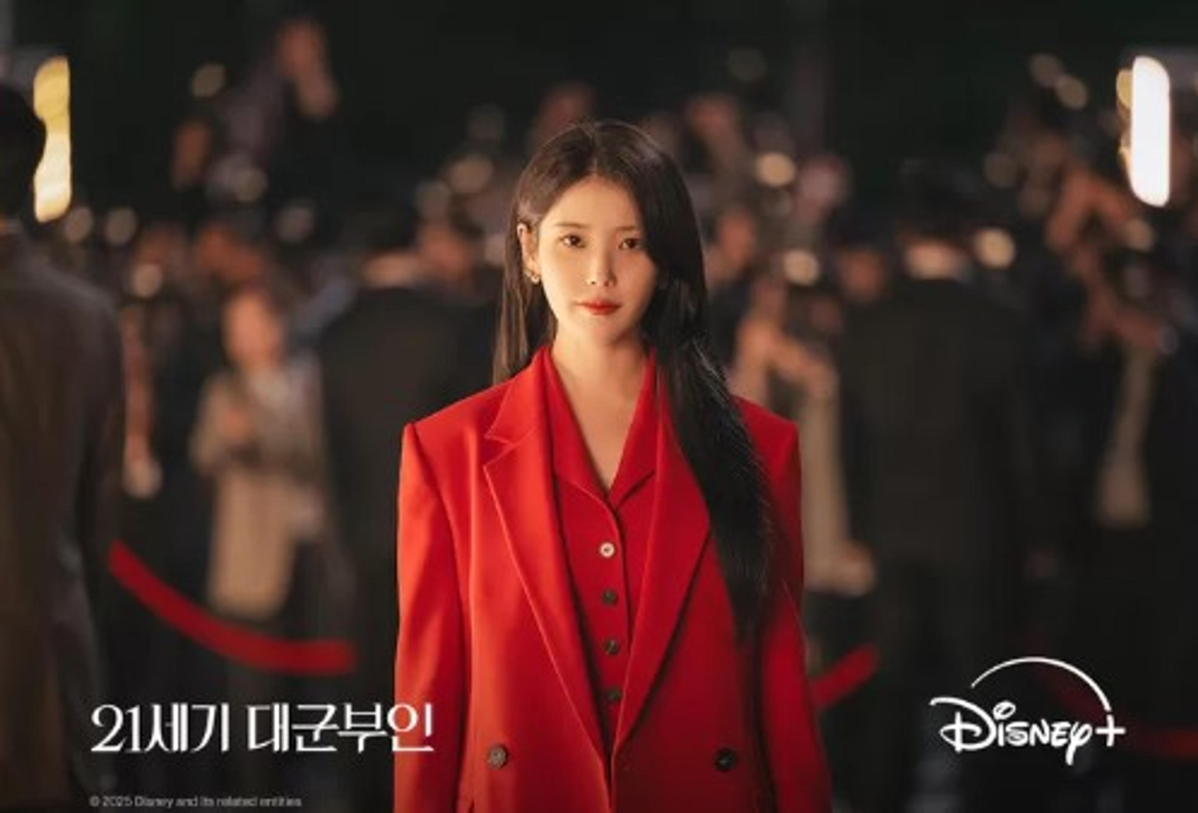 Ekspresinya susah ditebak, IU muncul dengan setelan jas merah menyala.