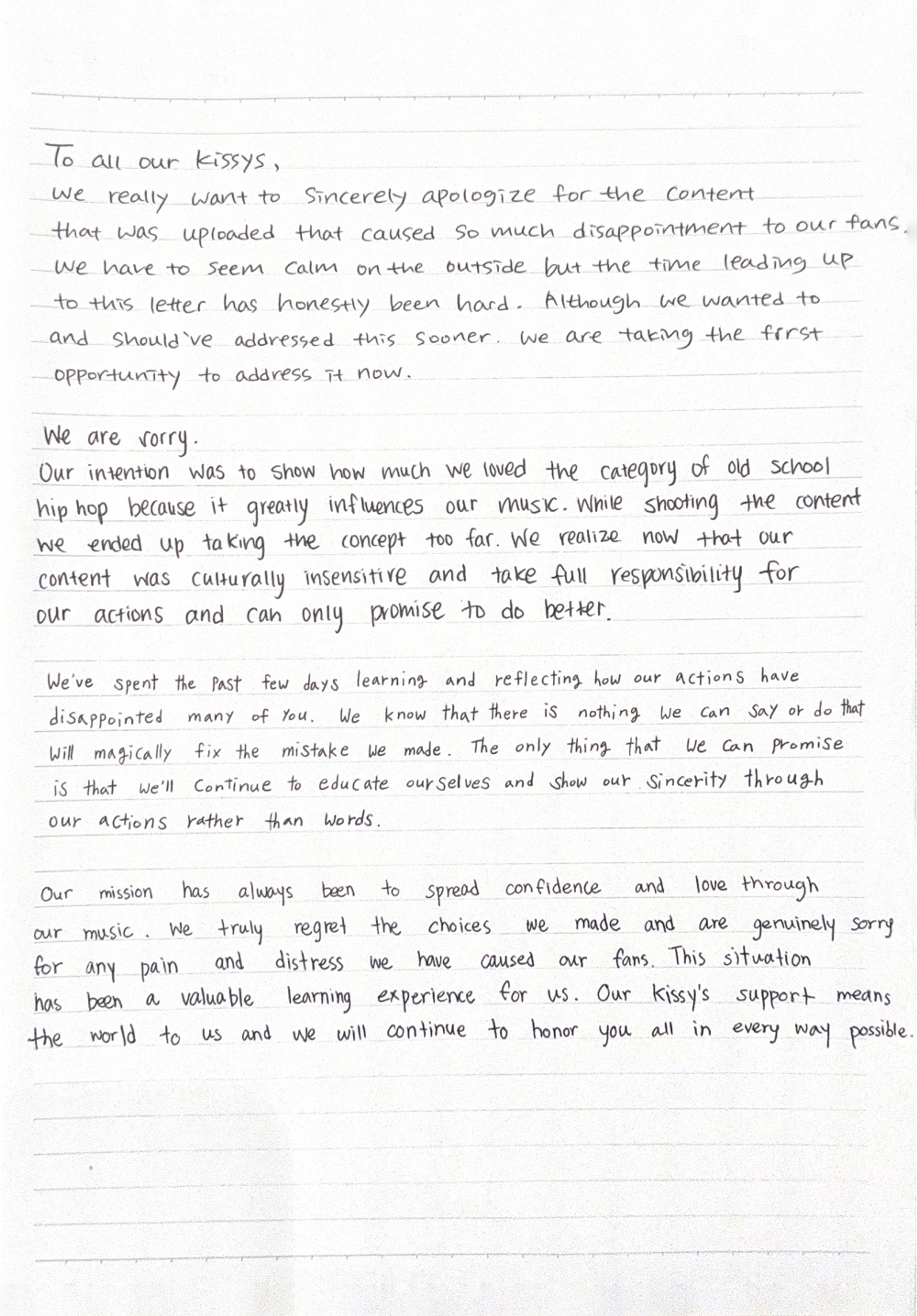 Catatan tersebut berisi satu paragraf dari setiap anggota, yang bertujuan untuk menunjukkan rasa penyesalan dan kesungguhan mereka. Dalam permintaan maaf tersebut, para anggota menyampaikan penyesalan yang mendalam atas dampak yang mereka sebabkan, serta menegaskan bahwa mereka sepenuhnya bertanggung jawab atas tindakan mereka.
