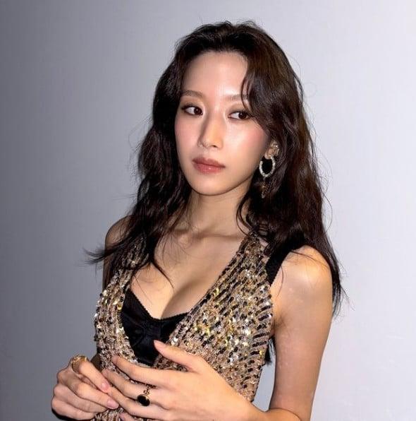 In the photos, Moon Ga Young is seen wearing a daring dress with a deep neckline, revealing a bralette, and exuding sultry beauty.