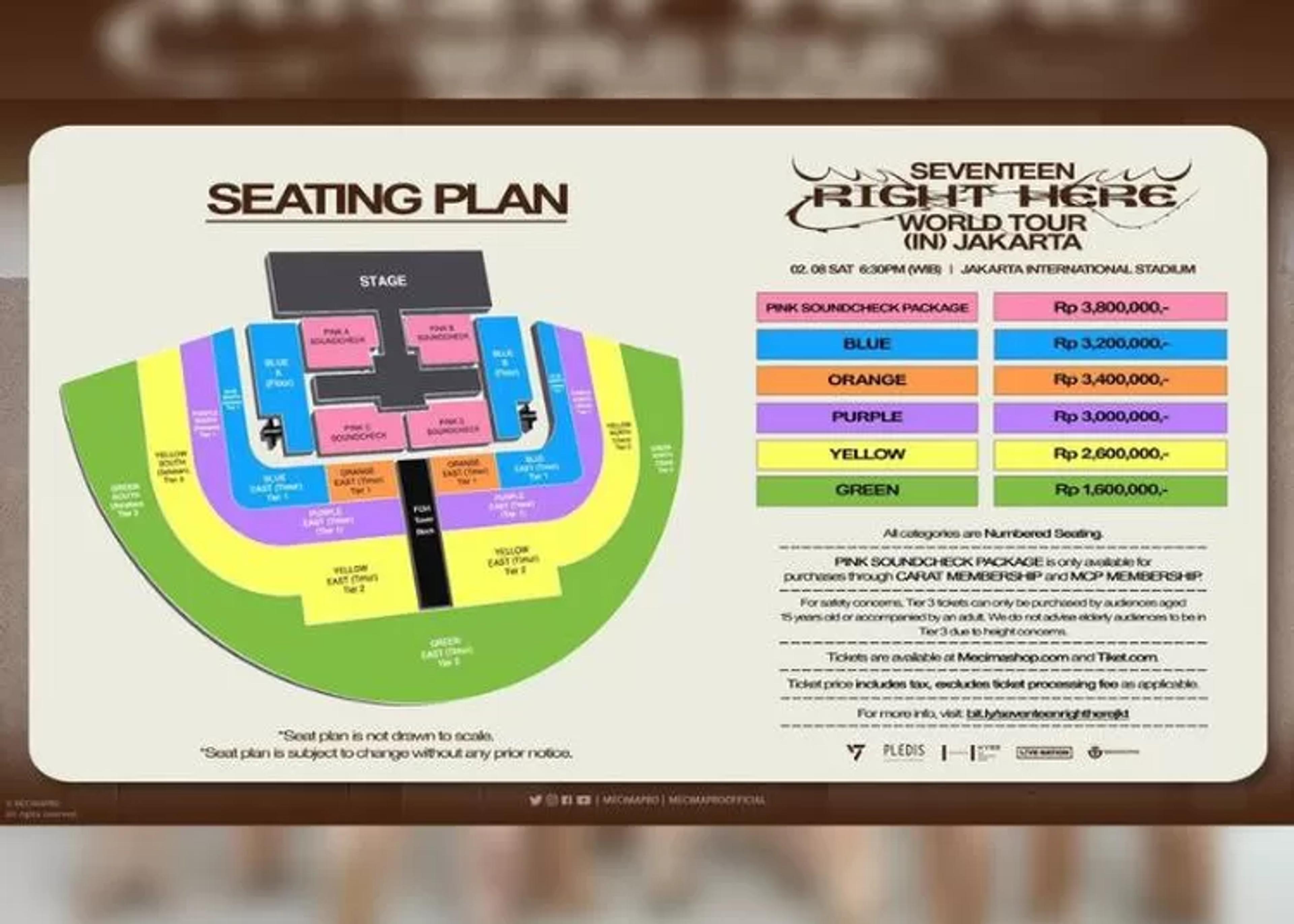 Berikut merupakan daftar harga SEVENTEEN RIGHT HERE WORLD TOUR (IN) JAKARTA, yang di promotori oleh Mecimapro: