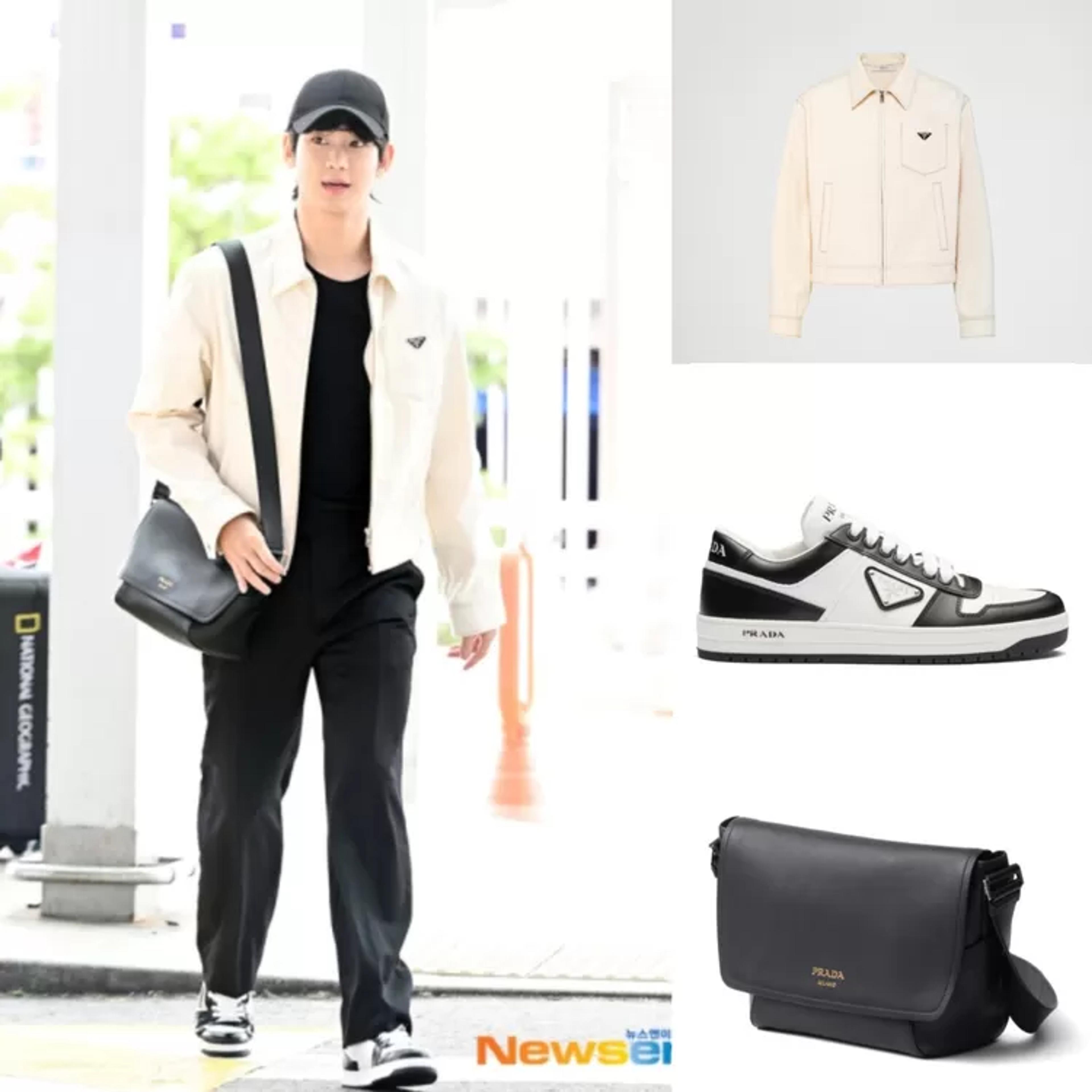 Pada saat keberangkatan menuju Indonesia, Kim Soo Hyun tampil memukau memakai outfit serba brand Prada dari atas hingga bawah.